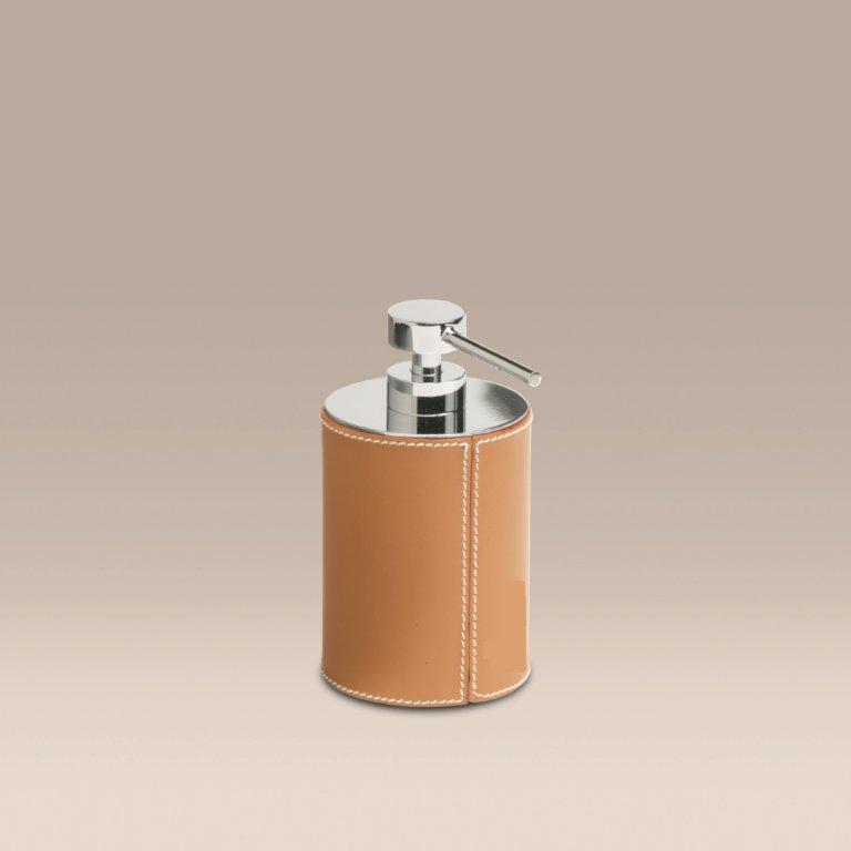 Stylish solid brass soap dispenser finished in chrome, is beautifully presented covered in tan leather.