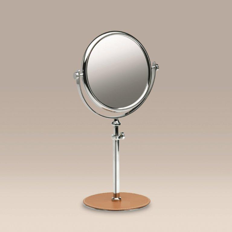 Table mirror made of solid brass has a round base and an extendable height. Finished in tan leather.