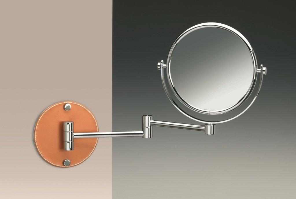 Solid brass, wall mountable mirror is adjustable with two extendable arms and a circular face. This elegant but practical mirror is finished in a combination of chrome and tan leather.