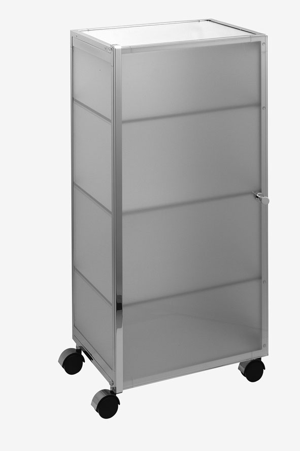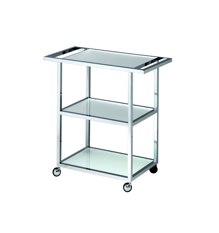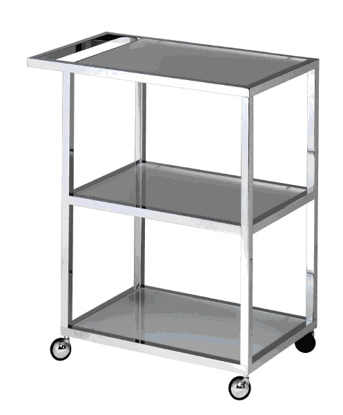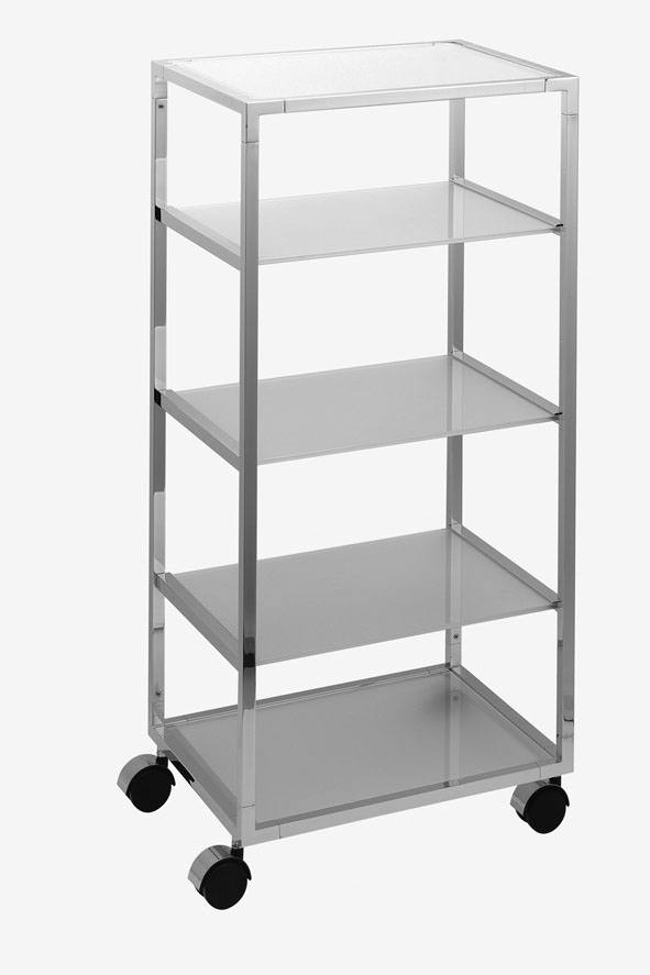 Stylish bathroom trolley on four wheels is made of solid brass and has a cube shaped frame. The trolley is presented with an exterior made of clear or frosted toughened security glass and finished in chrome or 24 carat gold.