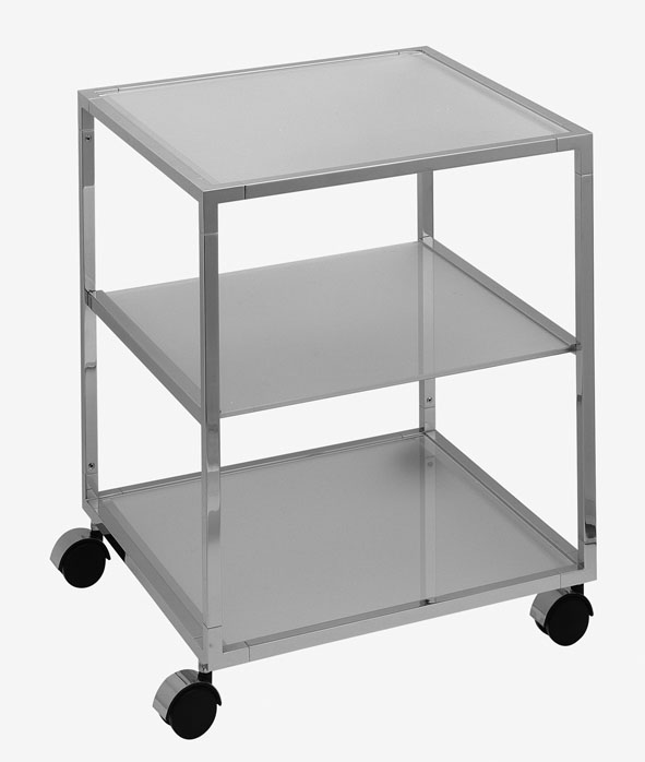 3 tier solid brass bathroom trolley with a cube frame is presented on four wheels with frosted or clear toughened security glass and finished in chrome or 24 carat gold plating.