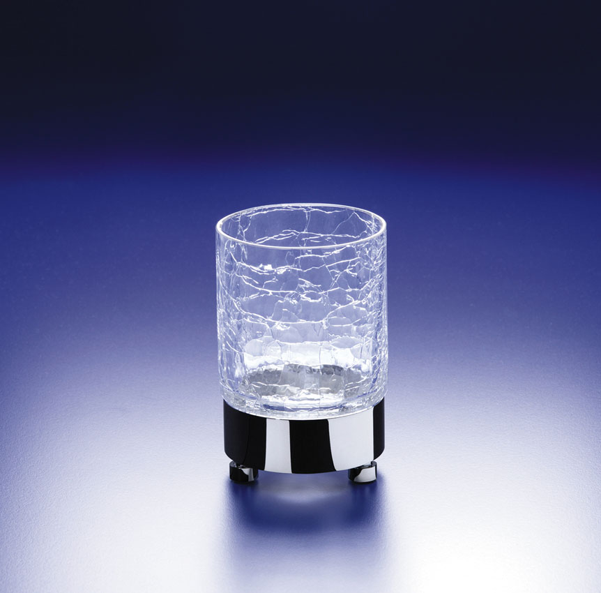 Cracked crystal tumbler sat on a solid brass base and is available finished in chrome, rustic brushed brass or satin nickel.