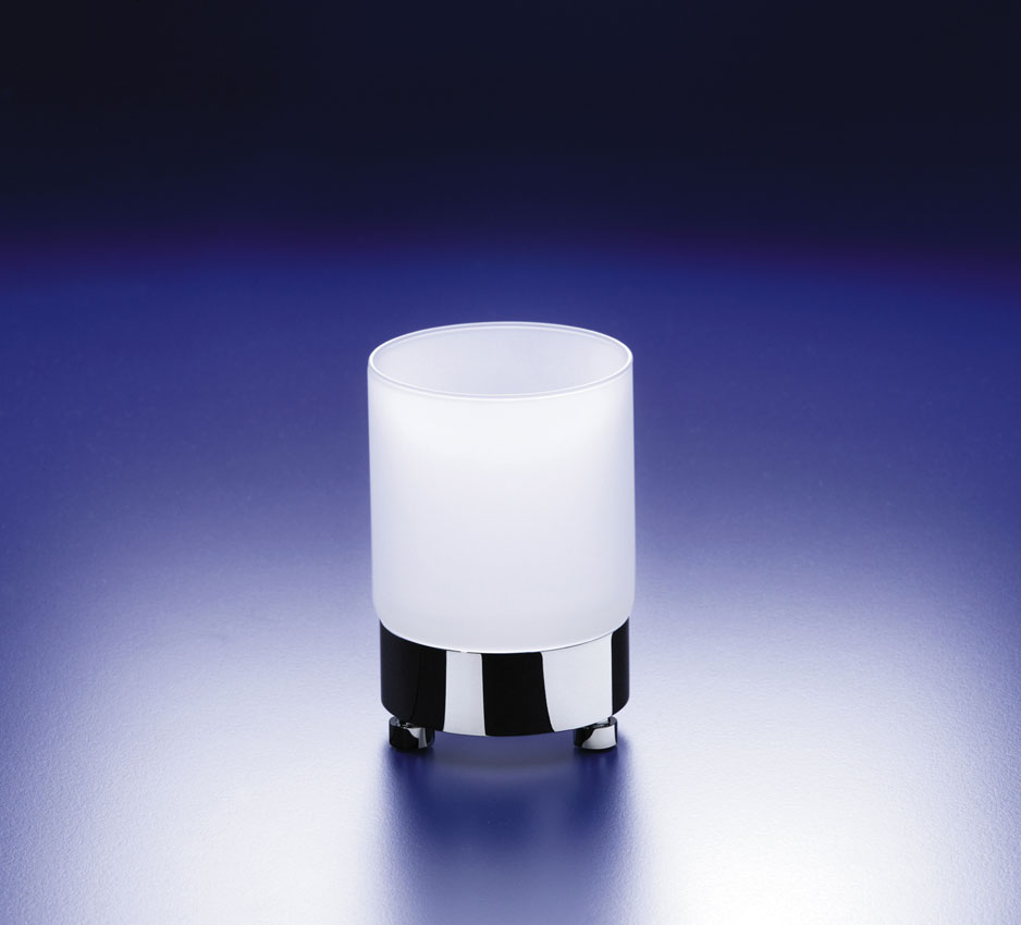 Stylish frosted glass tumbler on a solid brass base and is available finished in chrome, rustic brushed brass or satin nickel.