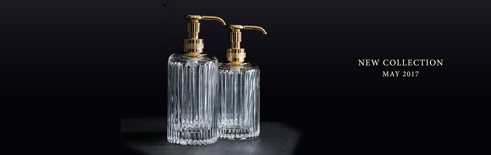 - Freestanding accessories made of solid brass, hand-blown crystal with brass fittings, and treated leather with brass (in various finishes such as 24K gold plated, chrome plated, combination of chrome and gold, satin nickel and satin chrome)