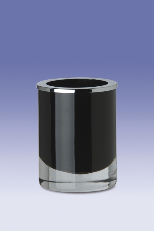 Black or white crystal glass brush holder with a solid brass rim finished in chrome.