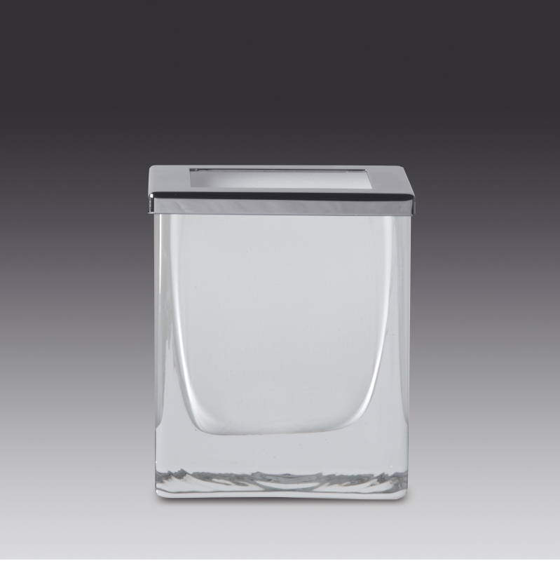 Crystal glass tooth brush holder is offered in white or black with a solid brass lid, finished in chrome and has four individual sections for keeping brushes separate.